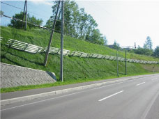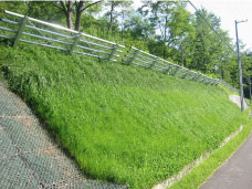 一般に、岩盤法面では、ラス張りを併用するが、土壌粒子結合材の使用により、ラス無しによる吹付を実施。 浄水汚泥・堆肥種子吹付工は、1:1.2程度より急勾配の切土法面などでは、当方法により、リサイクル材活用と工期、コストの大幅な縮減が可能となります。