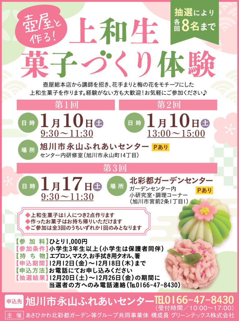 北彩都ガーデンセンターおよび旭川市永山ふれあいセンターにて、「壺屋と作る!上和生菓子づくり体験」を開催します。